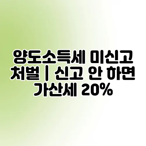 양도소득세를 신고하지 않을 경우, 기본적으로 가산세가 부과됩니다. 가산세는 미신고 세액의 20%에 해당하며, 이외에도 상황에 따라 추가적인 처벌이 있을 수 있습니다.